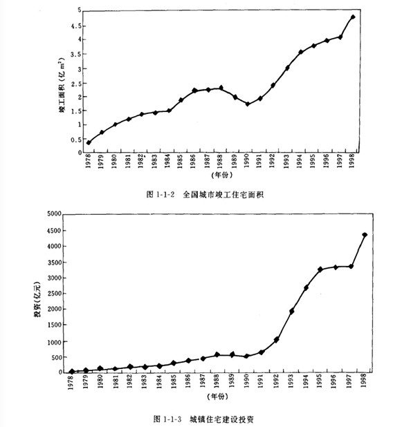 我國地域廣闊.人口眾多.房屋建筑規(guī)模巨大。其中住宅建設(shè)約占居住建筑的92%.而住宅,是世界各國都面臨的社會問題。“人人享有適當?shù)淖》?rdquo;已成為聯(lián)合國第二次人居大會所提出的戰(zhàn)略目標。改革開放以來.從1979年到1998年底.我國城鄉(xiāng)新建住宅建筑面積158億 ㎡其中城鎮(zhèn)住宅宅 約35億 ㎡.農(nóng)村作宅約123億MI.全國城市人均居住面積從3. 6 ㎡增加到9.3 ㎡(圖一1一1).竣 工面積從3 752萬 ㎡增加到47 600萬 ㎡(圖1-1-2).城鎮(zhèn)住宅建設(shè)投資從39.21億元增加到4 310.81億元(圖1-1 3). 1.7億戶遷入新居."八五"期間共完成城市住宅建設(shè)投資8 543億元.竣工 住宅10.5億 ㎡,僅1995年住宅竣工面積3.3億 ㎡.比“七五”期間增長76%.九五.期間計劃建設(shè) 住宅12億 ㎡,比“八五”期間增長14.3%.到1999年底。我國設(shè)城市加為668個.當年全國城市新 建房屋竣工面積4.362 5億㎡.其中住宅2.971 6億㎡.當年底.全國住宅總使用面積為30.505 2億 ㎡.總居住面積為21.011 2億㎡.人均使用面積達到14.2 ㎡.人均居住面積達到9. 8 ㎡分別比上 年增長0.6和0. 5 ㎡.居民生活條件大有改善。住宅建設(shè)量大面廣.至今仍呈上升趨勢.而且這個 上升趨勢還將持續(xù)20-30年。由此看出,我國住宅建設(shè)正處于快速發(fā)展階段.不僅是中國歷史上的 最高峰.也是世界上任何一個國家所不可比擬的。