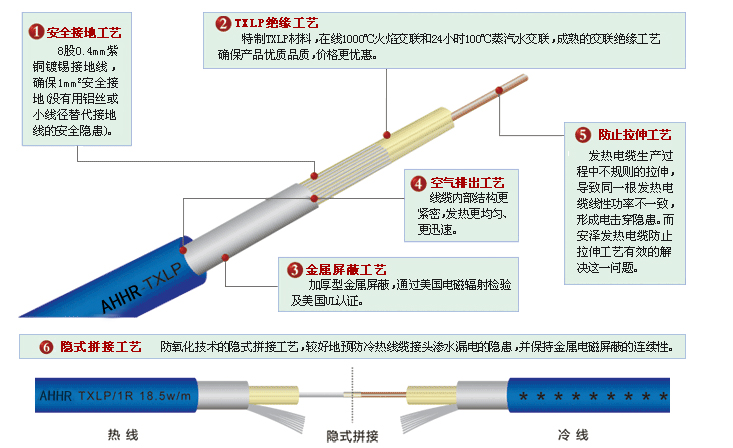 安徽環(huán)瑞研發(fā)了一種耐磨耐高溫型發(fā)熱電纜特點(diǎn):是在傳統(tǒng)發(fā)熱電纜結(jié)構(gòu)上增加了無色透明特氟隆絕緣層,與火焰及蒸汽交聯(lián)聚乙烯絕緣層構(gòu)成雙層絕緣,更安全。解決了因外界溫度過高導(dǎo)致線纜擊穿的問題;解決了有傳統(tǒng)發(fā)熱電纜鋪設(shè)的地面上不能有覆蓋物的問題。