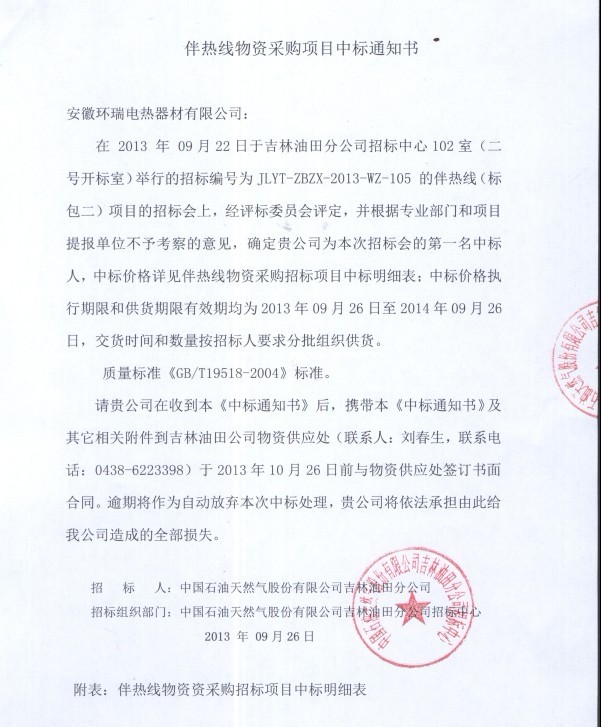 此次成功競標吉林油田,也是甲方在去年使用過我司的電伴熱帶后做的慎重選擇,是對于我司電熱帶產品質量的主要肯定。 本次項目包括自限溫、恒功率電熱帶兩大系列。目前正在緊張的進行后續的項目合作中。以下為環瑞中標通知書