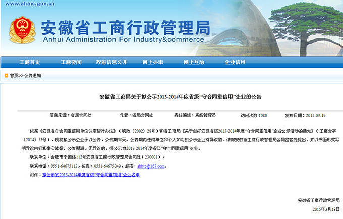 熱烈慶祝安徽環瑞榮獲2013-2014年度省級“守合同重信用”企業