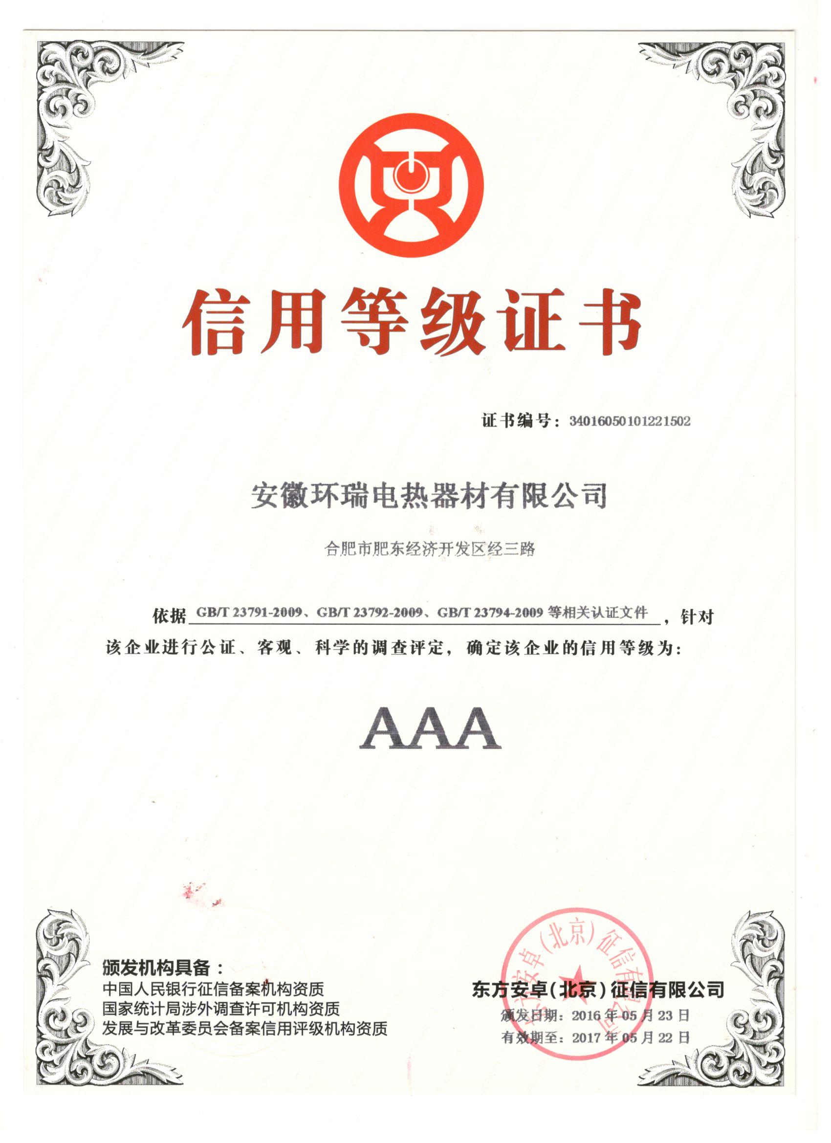 誠信是中華民族的傳統(tǒng)美德,誠信是一個企業(yè)立命之根,誠信是一個企業(yè)發(fā)展之本。“AAA”作為一個誠信的標(biāo)志,是對企業(yè)基本信息、綜合指標(biāo)、經(jīng)營發(fā)展、信用記錄等各個方面行為全方位的評價,熱烈慶祝安徽環(huán)瑞電熱器材有限公司榮獲 “企業(yè)AAA級信用等級證書”。